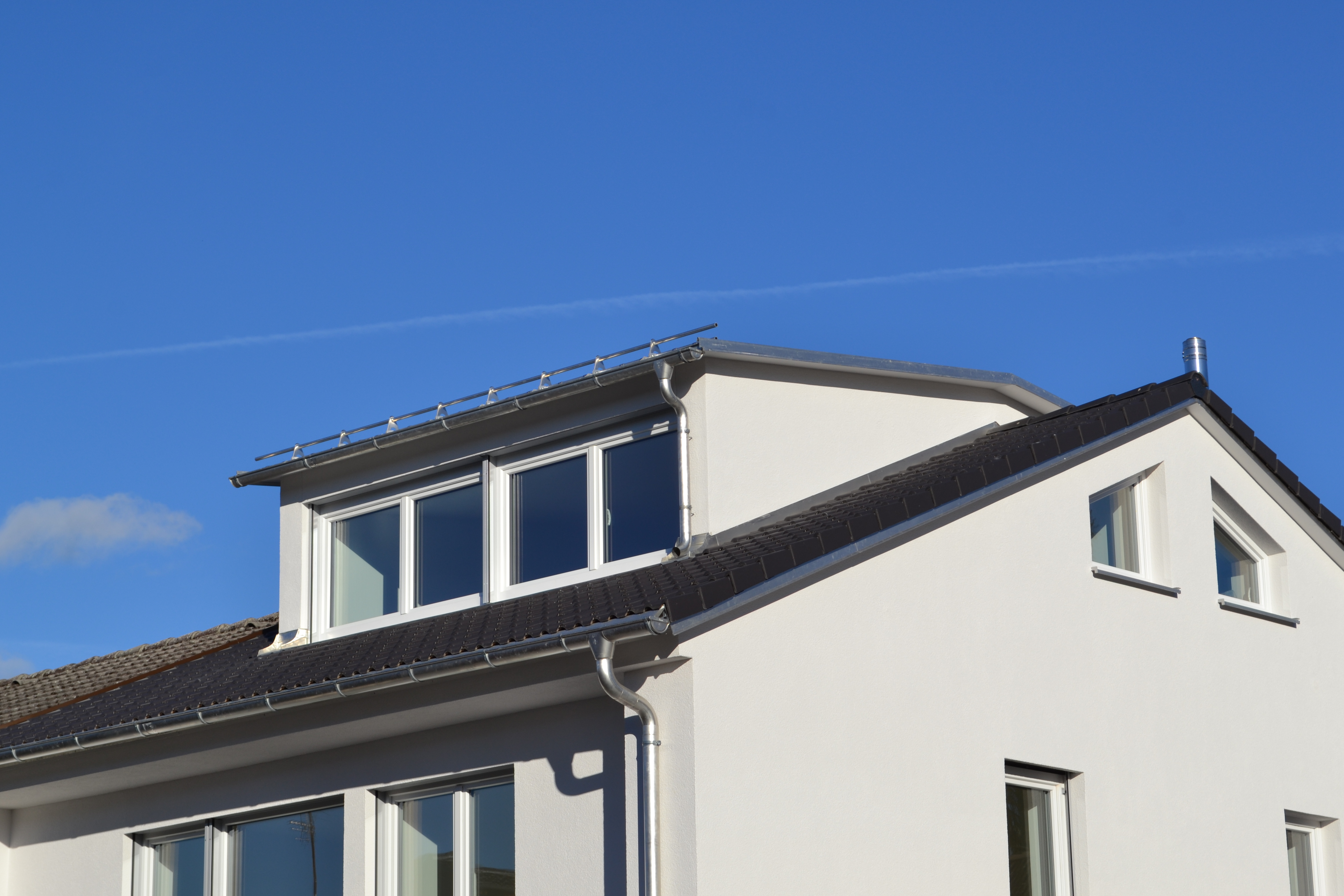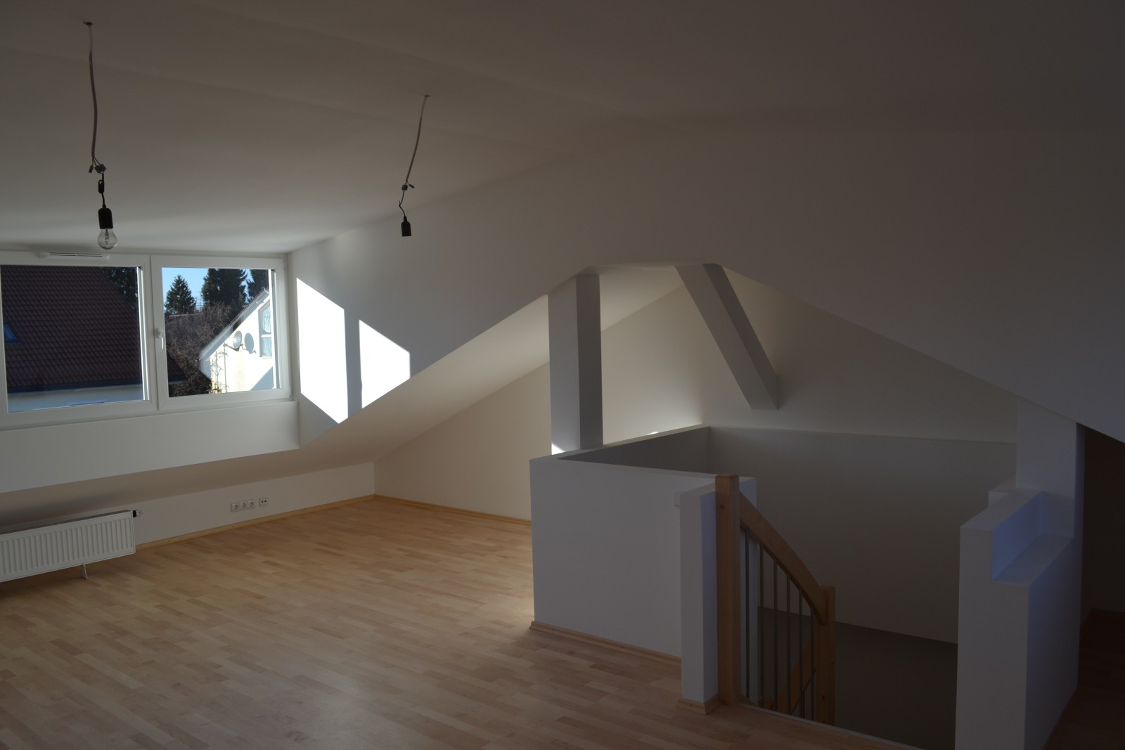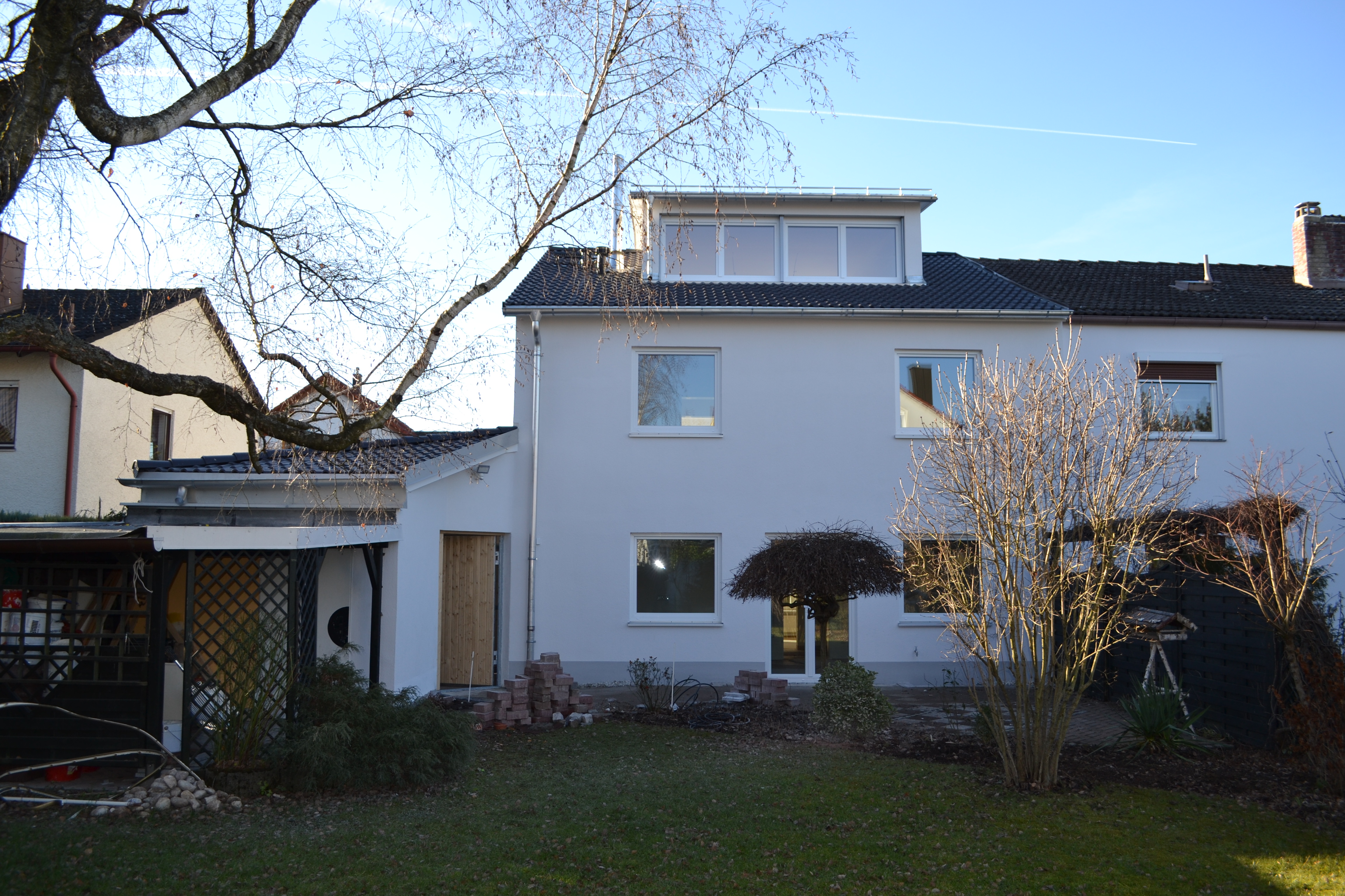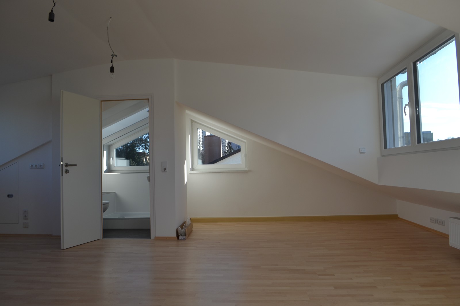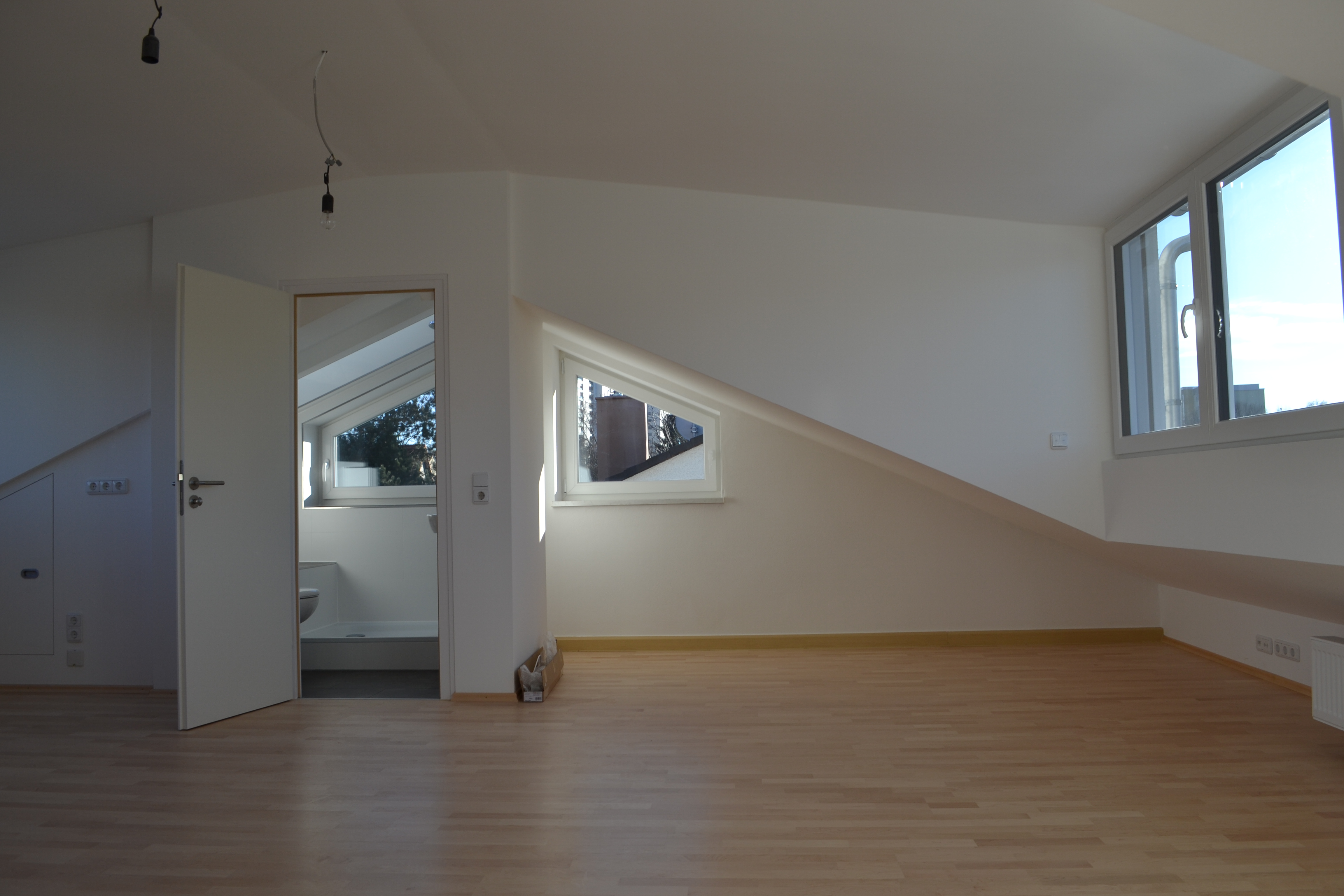 Die thermische Qualität der Gebäudehülle wurde durch eine Außendämmung der Fassade, eine Kellerdeckendämmung sowie den Einbau moderner Dreifach-Isolierglasfenster entscheidend verbessert. Neben der energetischen Sanierung wurde auch das Dachgeschoss trotz begrenzter lichter Höhe in ein hochwertiges Apartment bzw. Studio umgewandelt. Eine Erhöhung des bestehenden Firstes war aus rechtlichen Gründen (fehlende Zustimmung des Nachbarn bei Doppelhaushälften) nicht möglich. Dennoch konnte durch eine architektonisch geschickte Gaubenkonstruktion mit eigenständigem First ein gut belichteter, funktionaler Raum geschaffen werden. Die Zustimmung des Nachbarn konnte trotz Entbehrlichkeit dennoch erreicht werden – ein Zeichen der gelungenen Kommunikation und Rücksichtnahme im Planungsprozess.